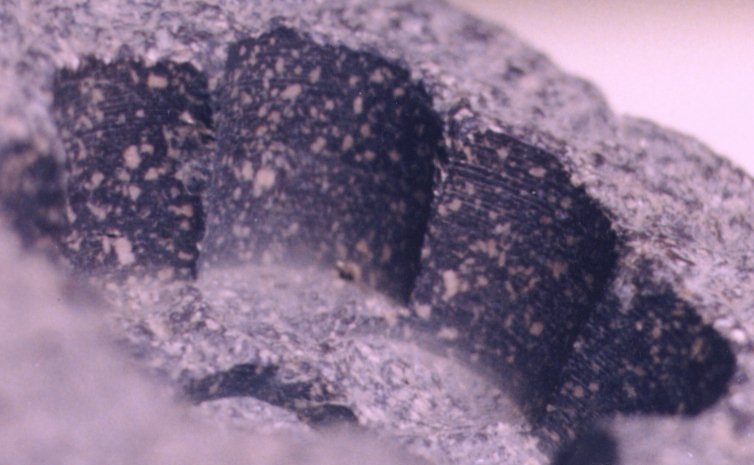 In 1996, this tube-drilled piece of granite was on display in the Cairo Museum without any associated identifying information. The photo (click to see full size) clearly shows spiral grooves on the visible portions. The grooves can be seen to be of regular depth and spacing, and occur in all of the holes in this piece. As the holes overlap, were these grooves caused by abrasive slurry, they would not be expected to be so consistent. These grooves seem to support Petrie's conclusion of "jewelled points" set into bronze tube drills.